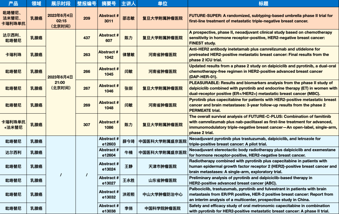 在乳腺癌领域,吡咯替尼、达尔西利、卡瑞利珠单抗、法米替尼,或产品间联合或联合化疗,共有13项研究入选(包括1项壁报讨论、6项壁报展示和6项线上发表)。