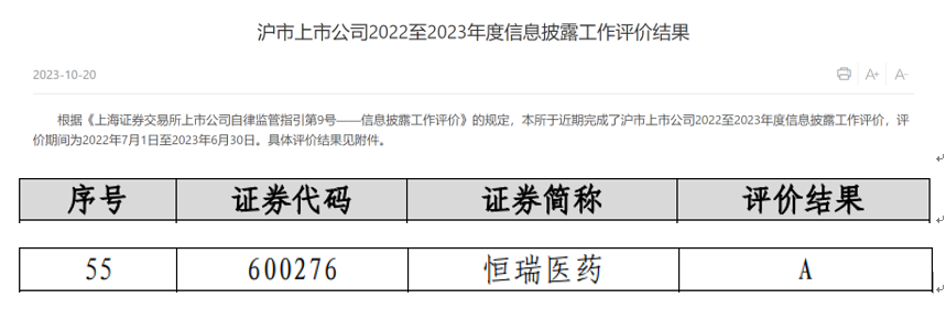 近日,上海交易所公布了沪市上市公司2022-2023年度信息披露工作评价结果,凭借在信息披露、规范运作以及投资者关系管理等方面的优秀表现,金年会金字招牌诚信至上医药获评A级。本次共有2160家沪市上市公司参评(包括499家科创板上市公司),评价等级从高到低依次为A、B、C、D四类,获得A类评价的上市公司占比约18.5%。